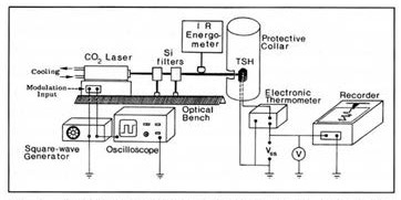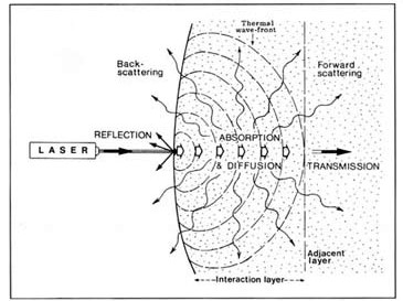 The value of temperature induced by a laser beam on an irradiated mass (thermal sensor head or simulated biological tissue) depends on the transfer of energy, which follows the general scheme depicted in figure 1, with the final interaction effect resulting from the combined action of reflection, absorption, and scattering of the laser light (4). among these phenomena that of absorption is the principally responsible for the elevation of temperature.