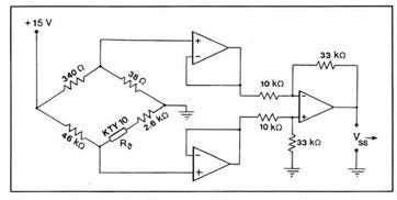 On the other hand, the thermal head, used as thermally sensitive target simulating dark biological tissue and at the same time as temperature measuring element, was a bulk PTc semiconductor thermistor of the KTY 10 type of Siemens co. This thermistor was connected as thermally variable resistor rϑ in the electric bridge of the electronic temperature measuring circuit shown in figure 3. This circuit has been designed and constructed specifically for the needs of the present experimentation on the basis of design suggestions of related technical literature (11-13). we have thus succeeded in implementing an electronic thermometer which is highly sensitive and speedy in response (13) with a linearity largely enhanced by the electronic circuitry of the stage, particularly for the range from o to 100°c where a technical sensitivity of about 14 mv/°c has been achieved. Note that, as seen in figure 2, the output voltage vss of the electronic thermometer in question is continuously monitored by means of a digital voltmeter and recorded by a chart recorder.
