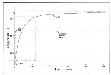 first of all, we have determined the thermooptical step response of the thermal head, i.e., the time variation of its instantaneous temperature ϑ just after the application of a stepwise cw laser “pulse”, such as the one shown by the dashed line of figure 4. The corresponding step response curve, ϑ versus t, where t denotes time, has been extracted and represented straightforwardly on the chart recorder for various levels of the laser power P incident upon the thermal head. one representative curve of this kind, obtained for an optical power P equal to 100 mw (step value) is depicted in figure 4. from these step response curves, the mean value of the thermal time constant (rise time) τr of the thermal head, defined as the time period needed for a rise of temperature from the 10% up to 90% of its final steadystate value, has been determined and found to be of the order of 10 min.