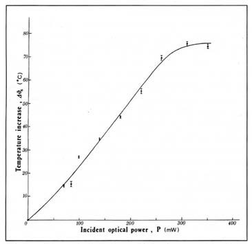 first of all, as seen from figure 5, in the case of an unmodulated laser beam the increase Δϑs in the steady-state temperature of the irradiated material (which, in our case, is simulated by the medium of the thermal sensor head) proved to be an increasing but non-linear function of the step-wise incident optical power P of the laser light stream. Moreover, as seen from the figure, at higher optical powers the nonlinearity in question turns particularly marked and the Δϑs – P curve enters a characteristic saturation region and tends to become horizontal; hence no additional temperature increase is further possible, no matter how much we further increase the incident laser power. This saturation effect should be attributed to thermal compensation phenomena, such as the balancing between the light energy absorbed by the thermally sensible mass and the amount of energy re-emitted by thermal radiation, while taking into account the dispersion of energy due to the scattering processes quoted in the 2nd section (fig.1).