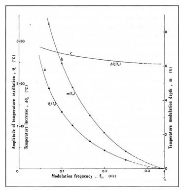 In addition, from those of the above recordings which concern a standard incident mean power of 100 mw we have extracted the corresponding variations of the amplitude ϑo of temperature oscillations and the temperature modulation depth m = ϑo / Δϑs with modulation, frequency/repetition rate fm. These variations are plotted in figure 8 by the curves a and b, respectively, along with the corresponding depend¬ence of the temperature increase Δϑs on the frequency fm (curve c).