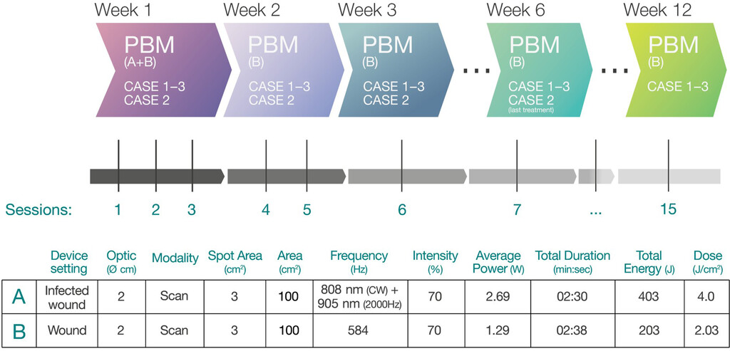 A class IV laser (Multiwave Locked System; Asa Srl) was used in all 3 cases. Three sessions were performed during the first week, followed by treatments every 72 hours in the second week and weekly sessions thereafter. The treatment was conducted in scanning mode using a collimated-lens handpiece (2-cm diameter, 3-cm2 spot area). In cases 1 and 3, sessions continued for a total of 12 weeks, whereas treatments were conducted for a total of 6 weeks in case 2. The operator wore protective goggles during all sessions to ensure safety. The affected areas were divided into multiple sections, with each section receiving the same dosage of 4 J/cm2 (“infected wound” mode) during the first session, followed by a dosage of 2.03 J/cm2 (“wound” mode) in subsequent sessions. The flowchart illustrates the different settings using a reference area of 100 cm2.