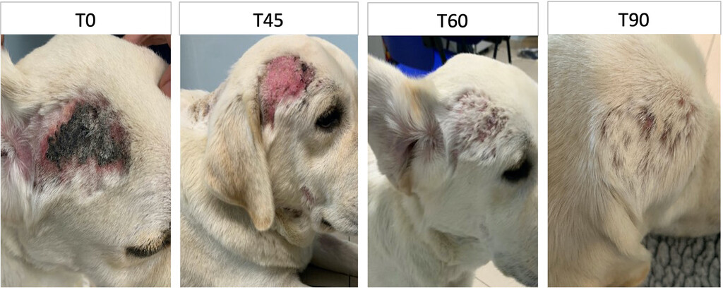 Wound healing progression in the right temporal region of case 1, a 5-year-old male Labrador Retriever, treated with adjunctive PBM therapy using a dual-wavelength near-infrared laser (808 and 905 nm; Multiwave Locked System; Asa Srl). Images were taken at different time points during treatment: T0, T45, T60, and T90 days. At T0, the temporal area shows crusts, marked erythema, and inflammation. By T45, crusts are reduced while erythema and inflammation persist. At T60, inflammation is markedly reduced, with initial hair regrowth visible. At T90, healing is complete, with full hair regrowth and a normal appearance of the treated area. The images illustrate the gradual and effective impact of PBM on tissue repair and regeneration in this case. Study period: 2022 through 2023.