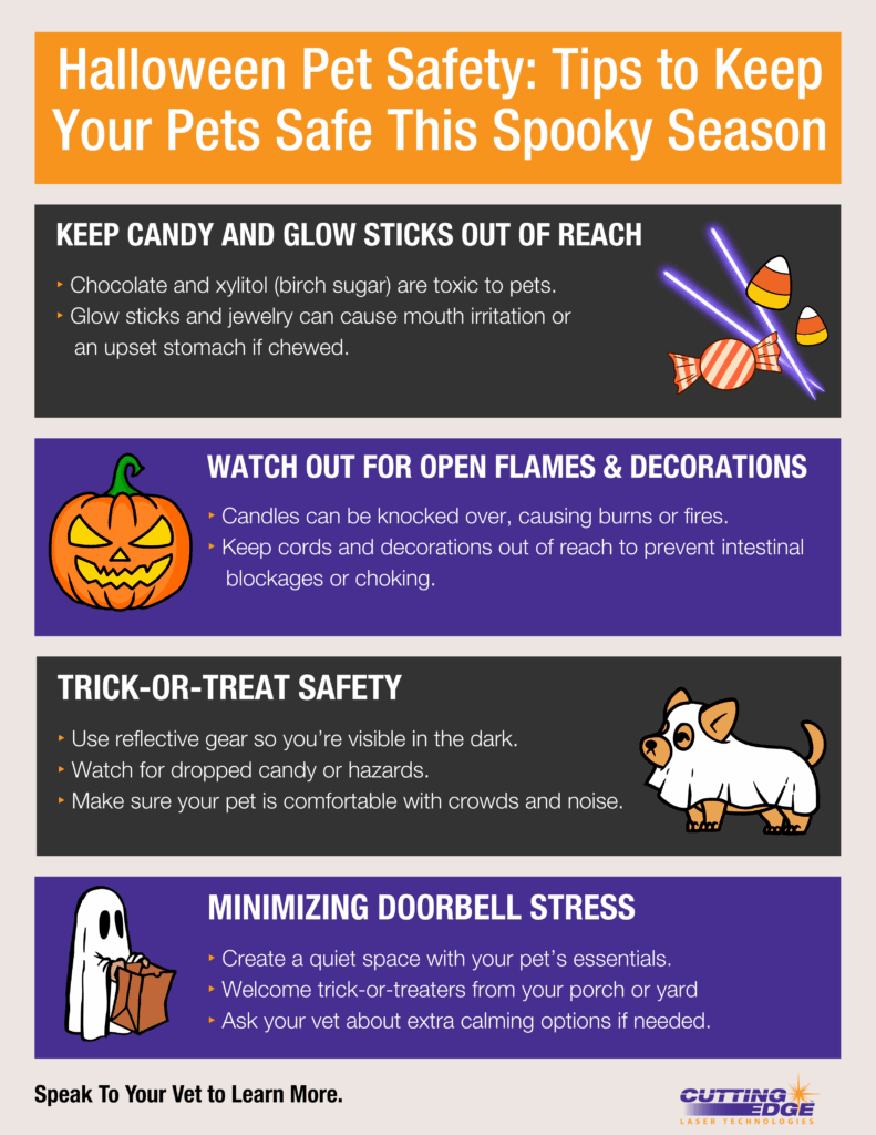 To make it even easier to keep your pets safe this Halloween, check out the infographic at the bottom of this article. It’s a handy, visual summary of all the key safety tips we’ve covered, from candy hazards to doorbell stress. You can print it out to share with your clients or post it in your clinic, or share it on your social media to help fellow pet owners keep their furry friends safe this spooky season.