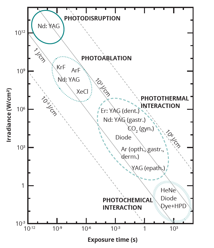 Laser therapies are based on the principle of light absorption by tissues and rely on three types of interactions: photochemical, photothermal and photomechanical interactions. In the first case, the photon energy is employed to trigger photochemical reactions, in the second the energy is converted into heat, while in the latter case mechanical effects are elicited. The prevalence of one or the other effect can be studied by considering the “chart of photo-induced effects” as detailed below. Generally speaking, laser interaction with tissue is governed by the following parameters: (i) laser wavelength, irradiance and light delivery mode for the laser source; (ii) the absorption and scattering properties (i. e. absorption and scattering coefficients) for the tissue. Irradiance, defined as the amount of light energy impinging on the tissue per unit of time and area, determines the intensity of the laser beam interacting with the target tissue.