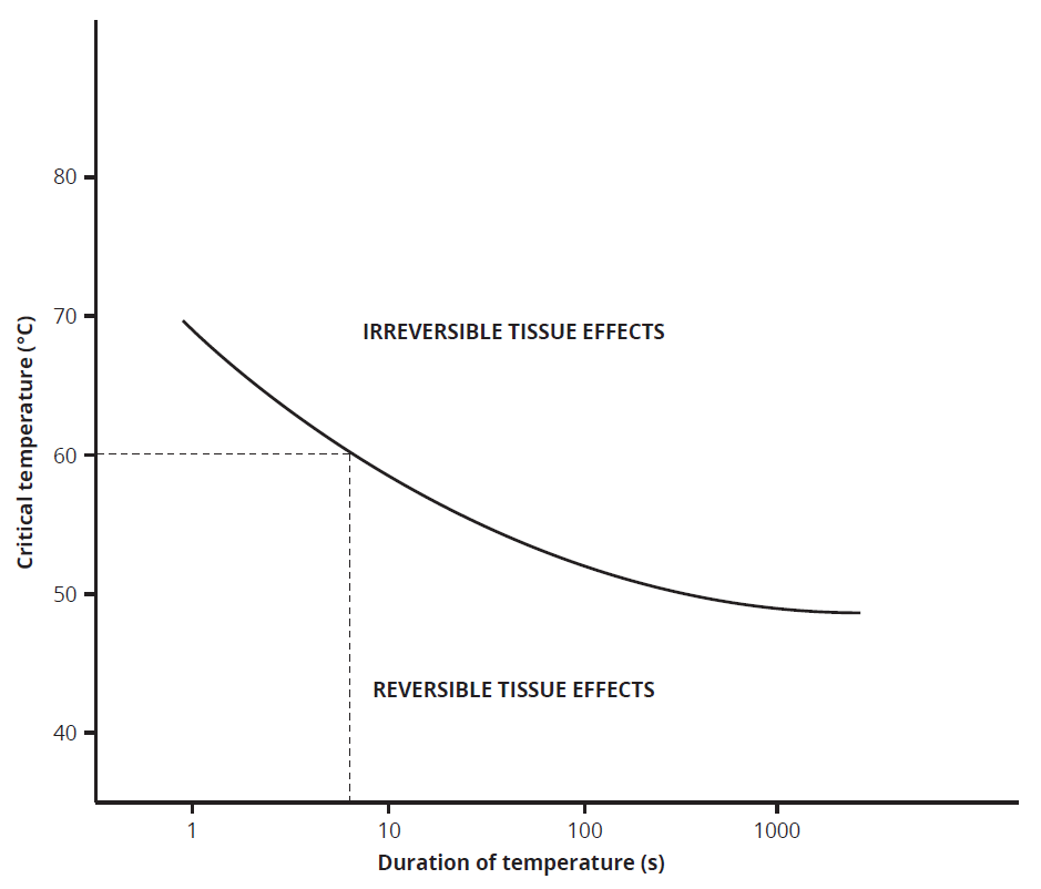 For a more detailed discussion on the pathological effects of temperature increase in tissues, we refer to Douplik [1] and Thomsen [6]. For a quick overview of photothermal effects, Table 1 summarizes the main effects that can be induced depending on the temperature reached by the biological tissue. Some of these effects can be classified as reversible or irreversible, based on whether the tissue can return to its normal state once the temperature increase ceases. Reversible damage allows the cell or tissue to recover, while irreversible damage occurs rapidly, typically within seconds to minutes, and cannot be repaired through natural healing processes, which usually take days or weeks. Fig. 2 illustrates the conditions under which irreversible biological effects are achieved.