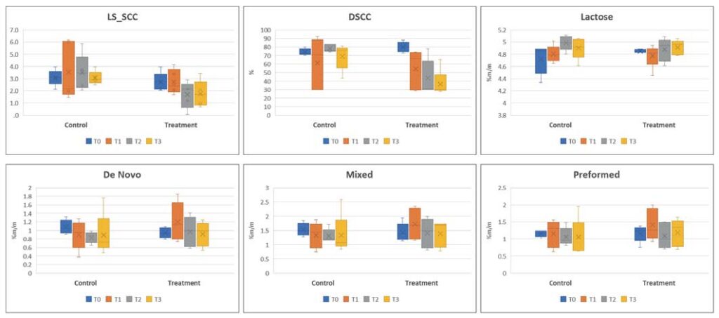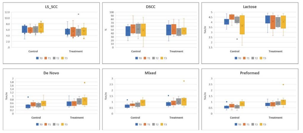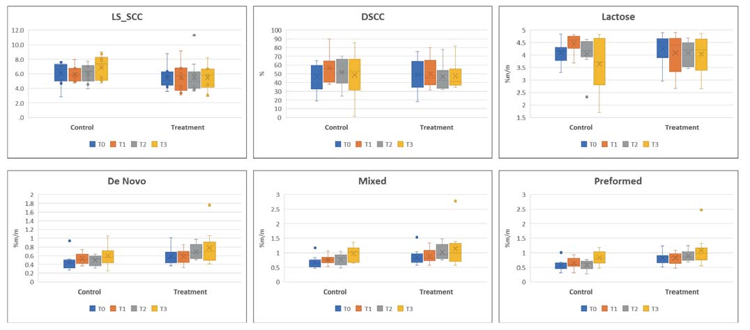 Intergroup analyses showed no significant differences in Lin-ear Score of SCC (LS_SCC), DSCC, Lactose and Mixed fatty acid between the control and treatment group at all evaluation times. However, at the end of the treatment cycle (T2), De Novo fatty acid showed a significant difference between the treatment and control groups, with higher values in the treatment group (Mean ± SD (Median) – treatment: 0.69 ± 0.17 (0.68); control: 0.49 ± 0.12 (0.52). The p-value was 0.020.